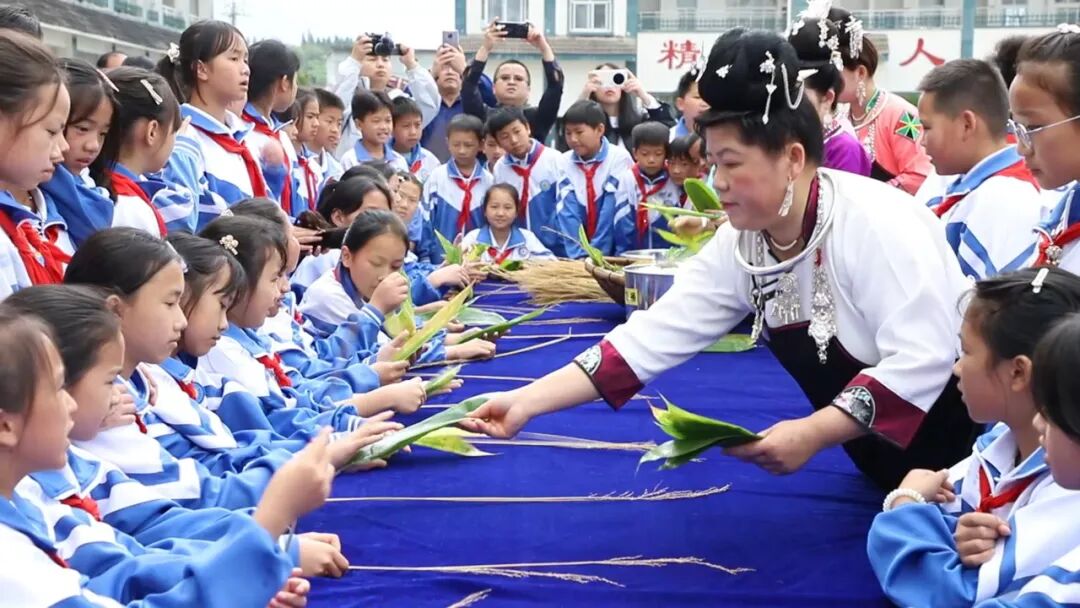 走进丹寨县金钟第一小学,一场别开生面的诵读活动正在开展,由100名同学组成的朗诵团齐声诵读《永恒的端阳》,大家用稚嫩的童声传递着对先贤屈原的追思此外,学校还开展了包粽子活动,身着苗服的阿妈手把手带领同学们亲手包粽子,感受传统文化与节日氛围,现场欢声笑语不断。