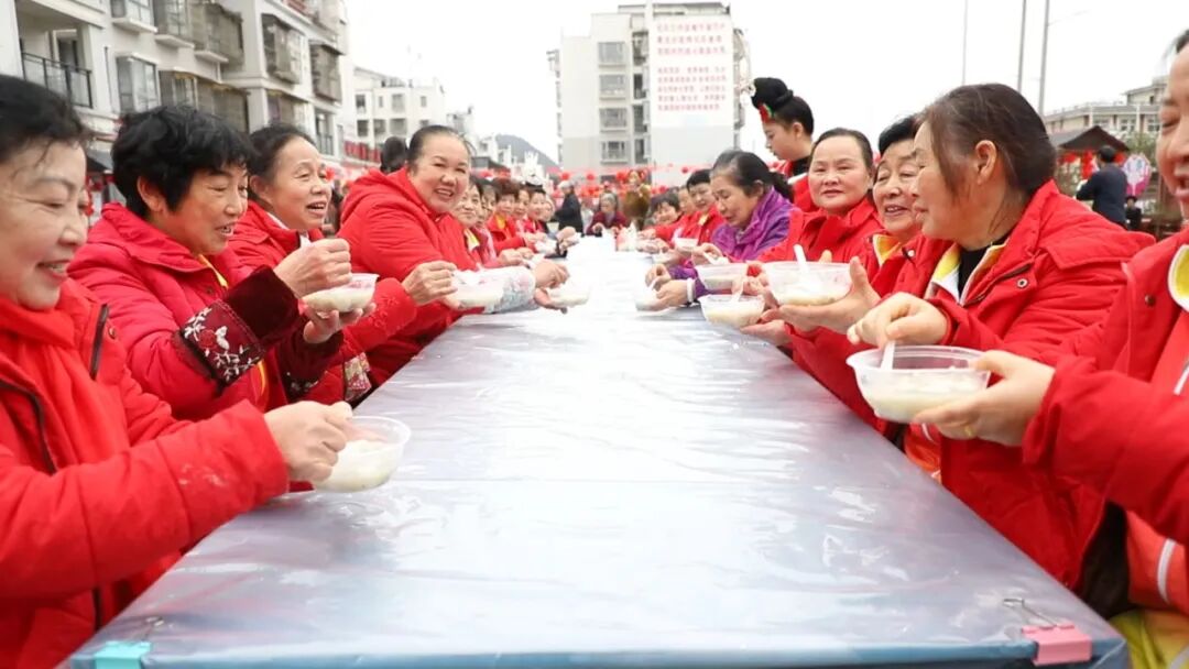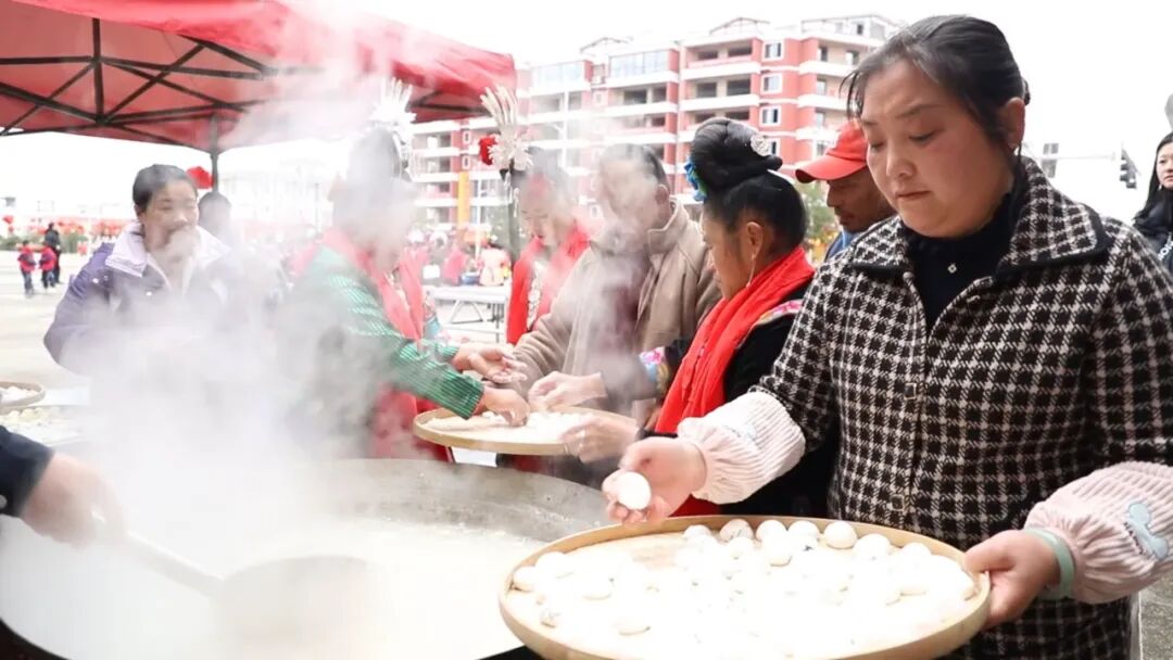 不远处的锅里,清水沸腾翻滚,一个个圆润饱满的汤圆下锅后,随着热气缓缓浮起,香气四溢。志愿者们忙碌着捞起汤圆、盛入碗中,将热气腾腾的酒酿汤圆送到每一位群众手中,大家围坐在一起,你一口我一口,品尝着香甜软糯的汤圆,畅谈着日子的新变化,热闹的氛围里满是团圆与幸福。