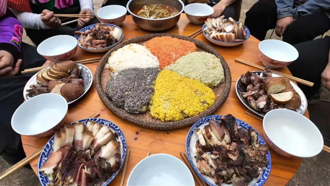 “这些彩色的糯米饭都是用纯天然植物染出来的颜色。”村民莫太芬介绍道,“黄色的取自密蒙花,红色和黑色则由洛神花与枫香叶浸染而出,五种颜色,一味天然。”