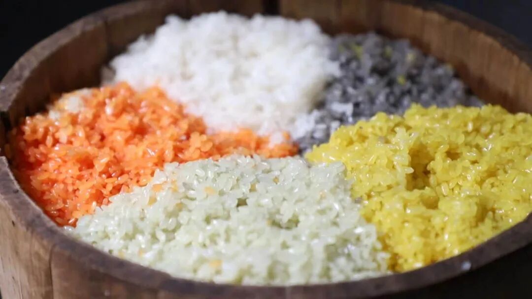满载而归后,妇女们将新鲜采摘的植物清洗、捣碎、熬煮,制成天然染料。各色汁水倒入糯米浸泡一夜,米粒便悄然染上了春日的色彩。次日,妇女们将染好的糯米依次放入木蒸桶,用柴火蒸上五十分钟,五色糯米饭便飘香出锅。