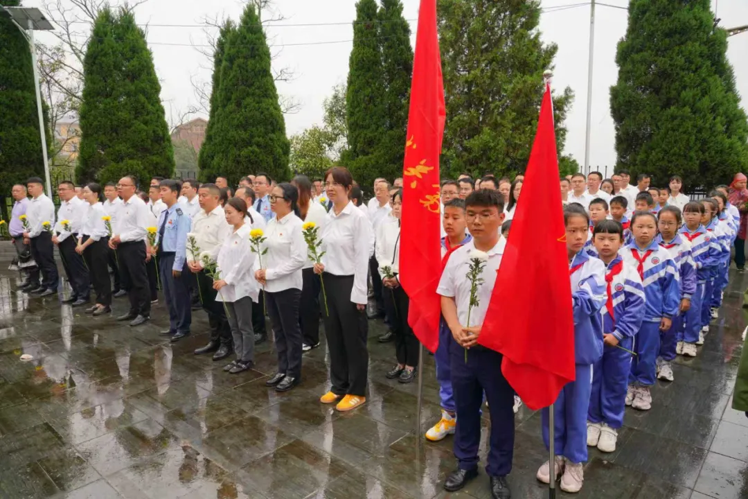 默哀毕,少先队员献唱《我们是共产主义接班人》,并致少年先锋队队礼。在深情的《献花曲》中,礼兵手抬花篮、正步前行,将花篮郑重摆放在纪念碑基座上。王永明缓步登上纪念碑基座,在花篮前驻足凝视,仔细整理花篮缎带。随后,全体人员瞻仰烈士纪念碑,依次向革命先烈敬献鲜花,缅怀革命先烈的丰功伟绩,表达对革命先烈的无限怀念和崇高敬意。