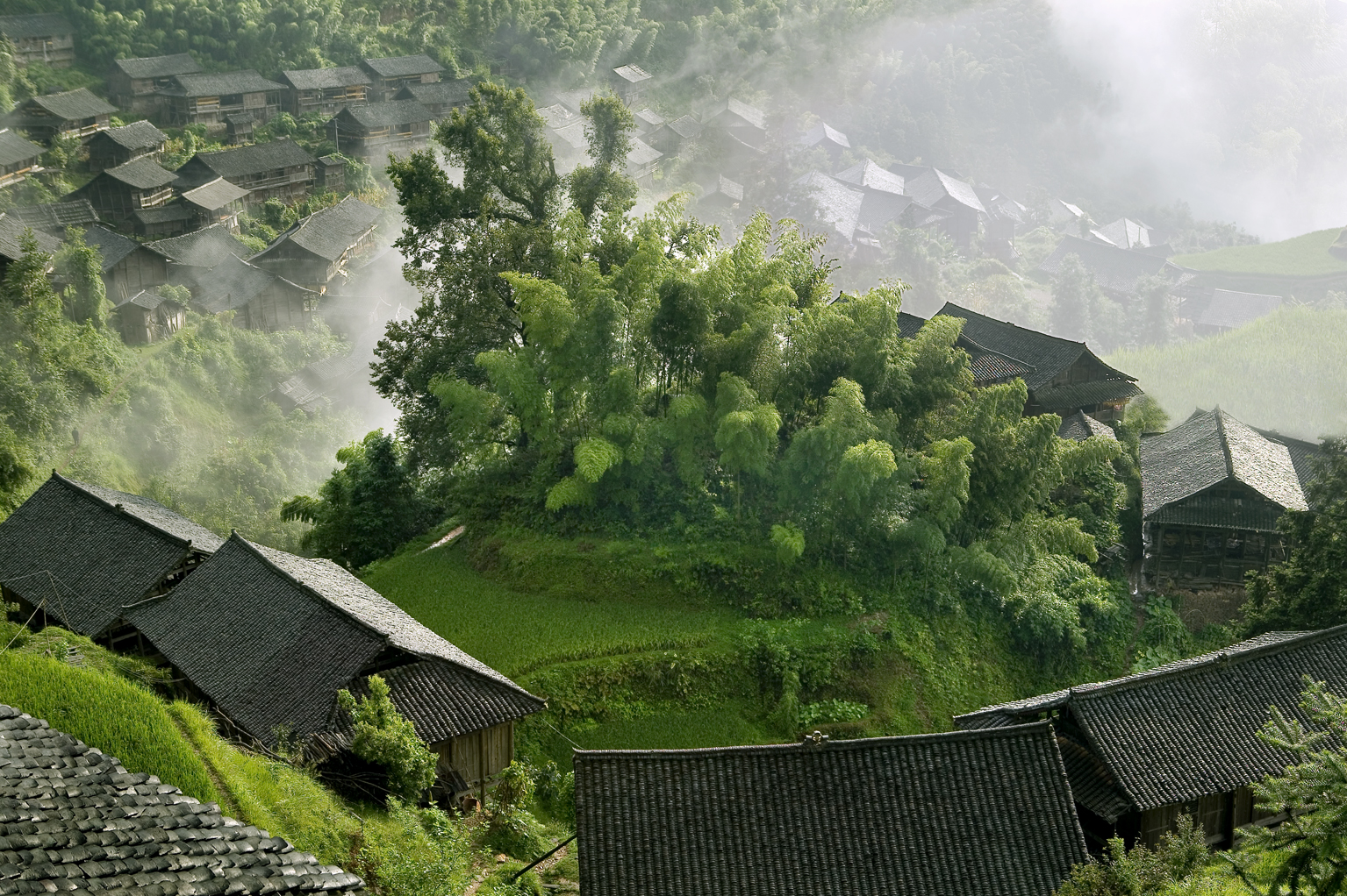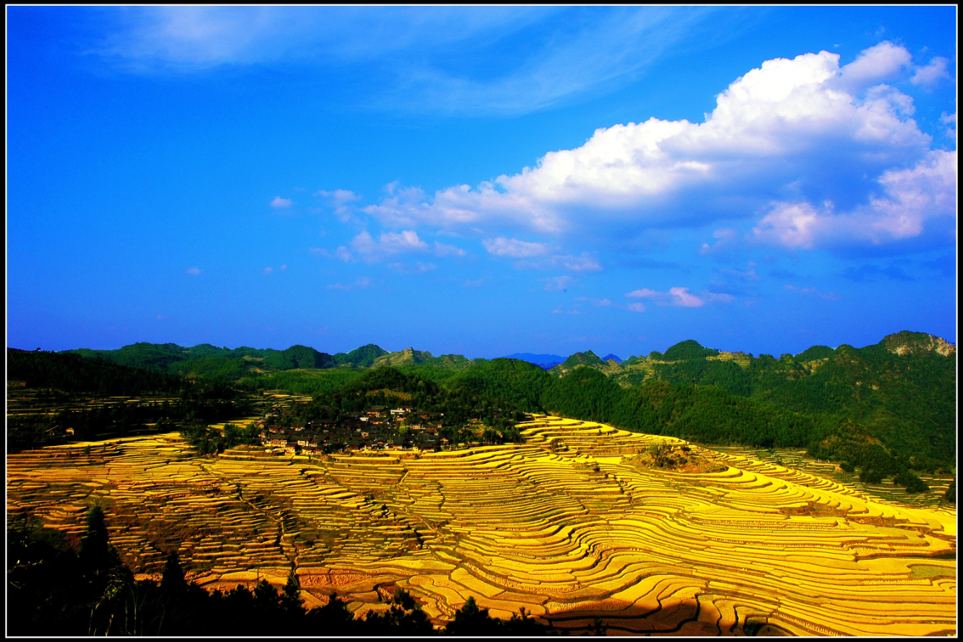 一千多亩梯田景观,位于一座大山之上,顺着山势,层层叠叠,从山顶一直延伸至山脚。梯田也像一条条美丽的苗家腰带,装点着雄浑的大山。岁月早已过去几百年,辛勤的苗家儿女年复一年在这里耕耘,繁衍,年年岁岁演绎着特有的农耕文化与大地艺术。这可是一个令人想象不到的美丽地方,每到秋天,高要梯田群充满了一种令人欢快愉悦的金黄色。甚至连那里的风,也是金黄色的。