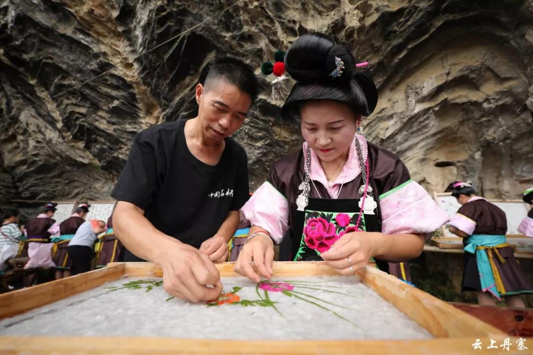 ▲贵州省丹寨县南皋乡石桥村皮纸作坊,王兴武在教苗族村民制作花草纸。