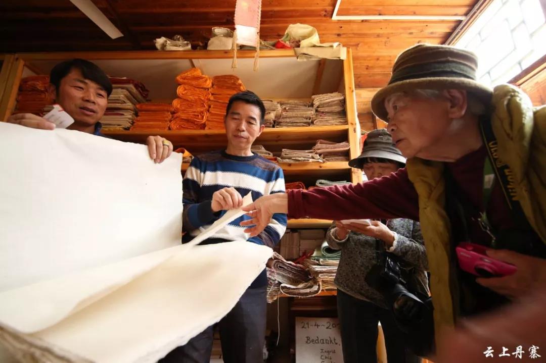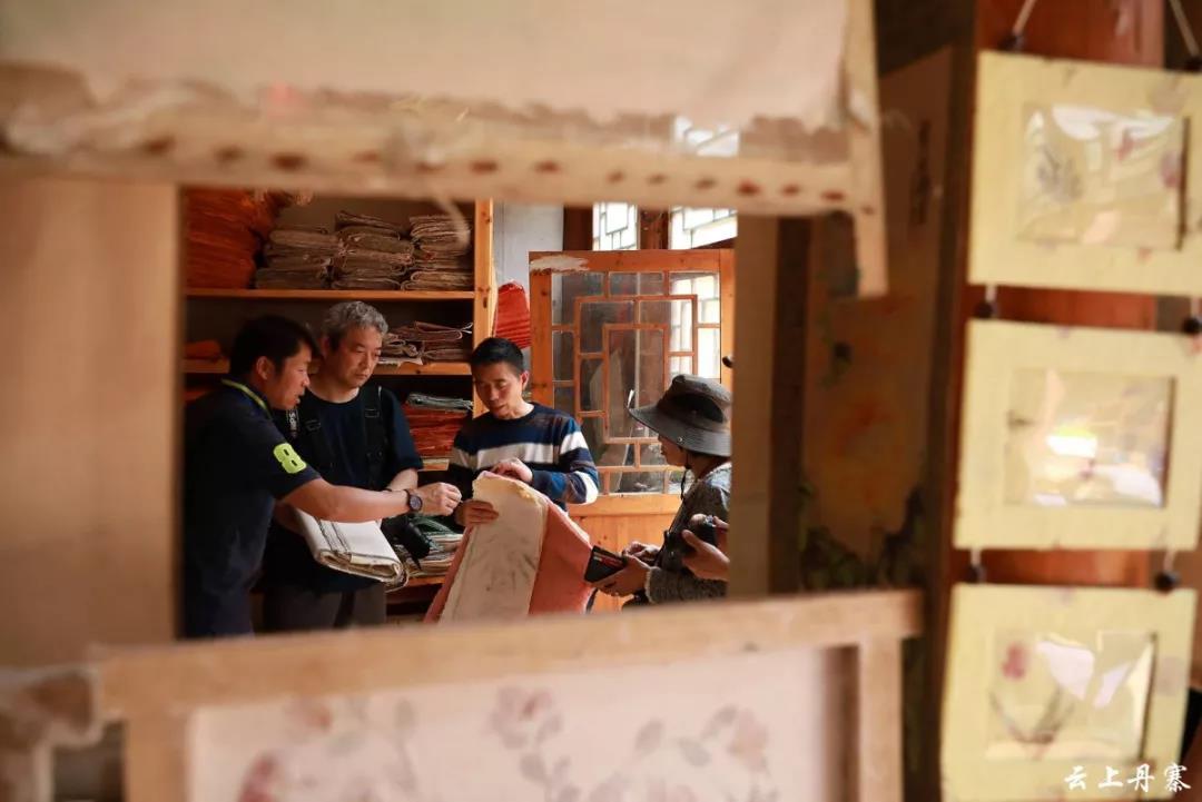 ▲贵州省丹寨县南皋乡石桥村手工皮纸展示馆,王兴武(左二)在向日本游客介绍新式白皮纸的质量。