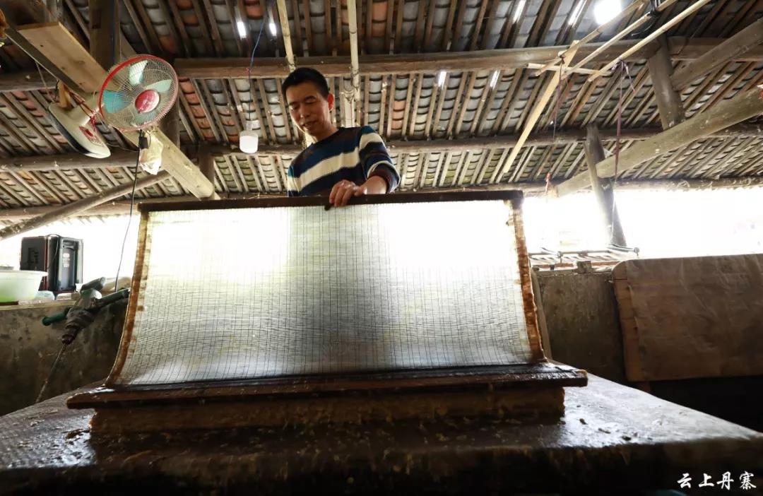 ▲贵州省丹寨县南皋乡石桥村皮纸作坊,王兴武在制作手工皮纸。