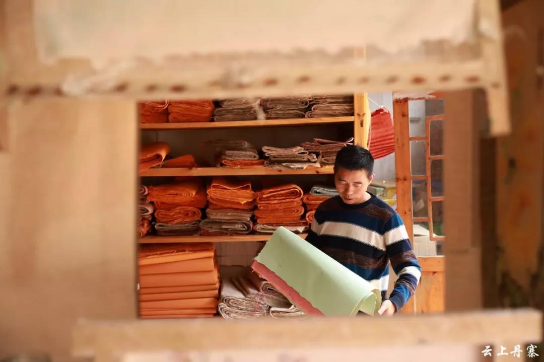 ▲贵州省丹寨县南皋乡石桥村手工皮纸展示馆,王兴武在整理彩色手工皮纸。