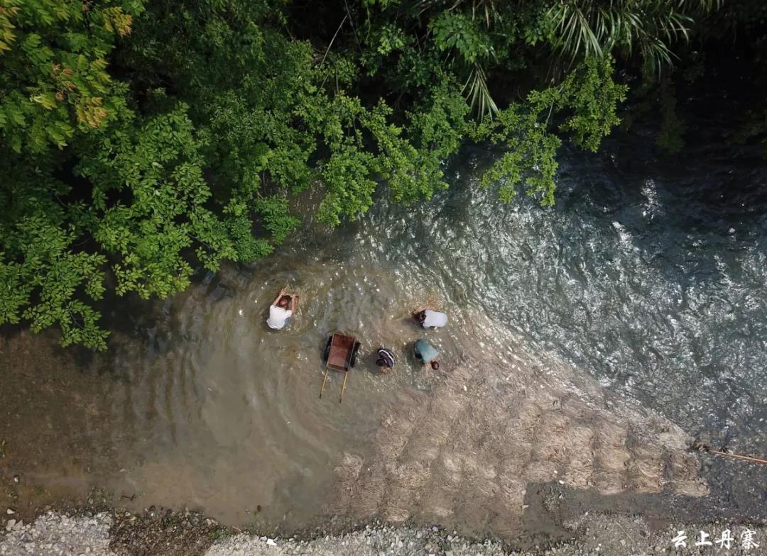▲在贵州省丹寨县南皋乡石桥村,王兴武(左二)和工匠们在河里清洗造纸原料(无人机拍摄)。