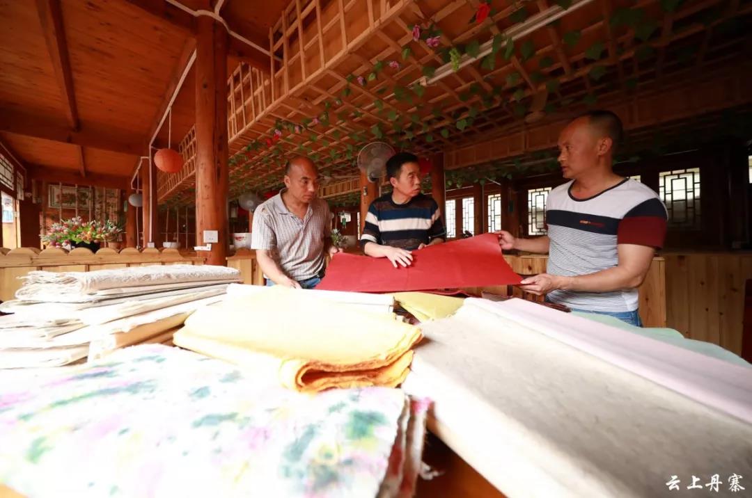 ▲贵州省丹寨县南皋乡石桥村手工皮纸展示馆,王兴武(中)和工匠们在讨论彩色手工皮纸的工艺改良技术。