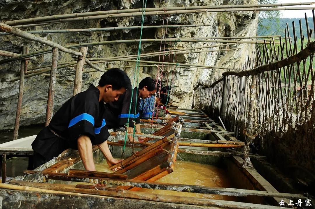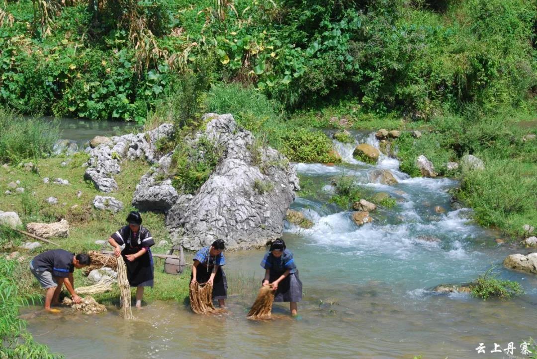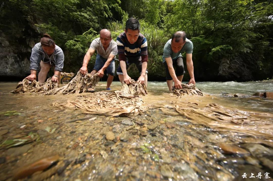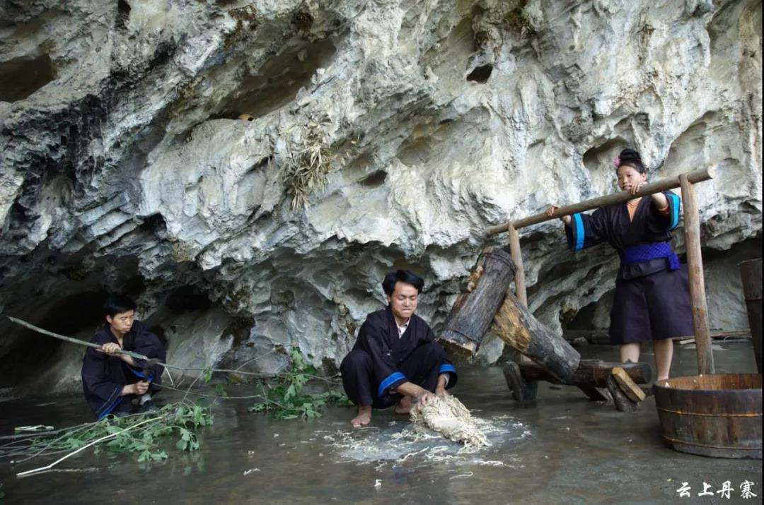 ▲在贵州省丹寨县南皋乡石桥村,王兴武(右二)和工匠们在河里清洗造纸原料。