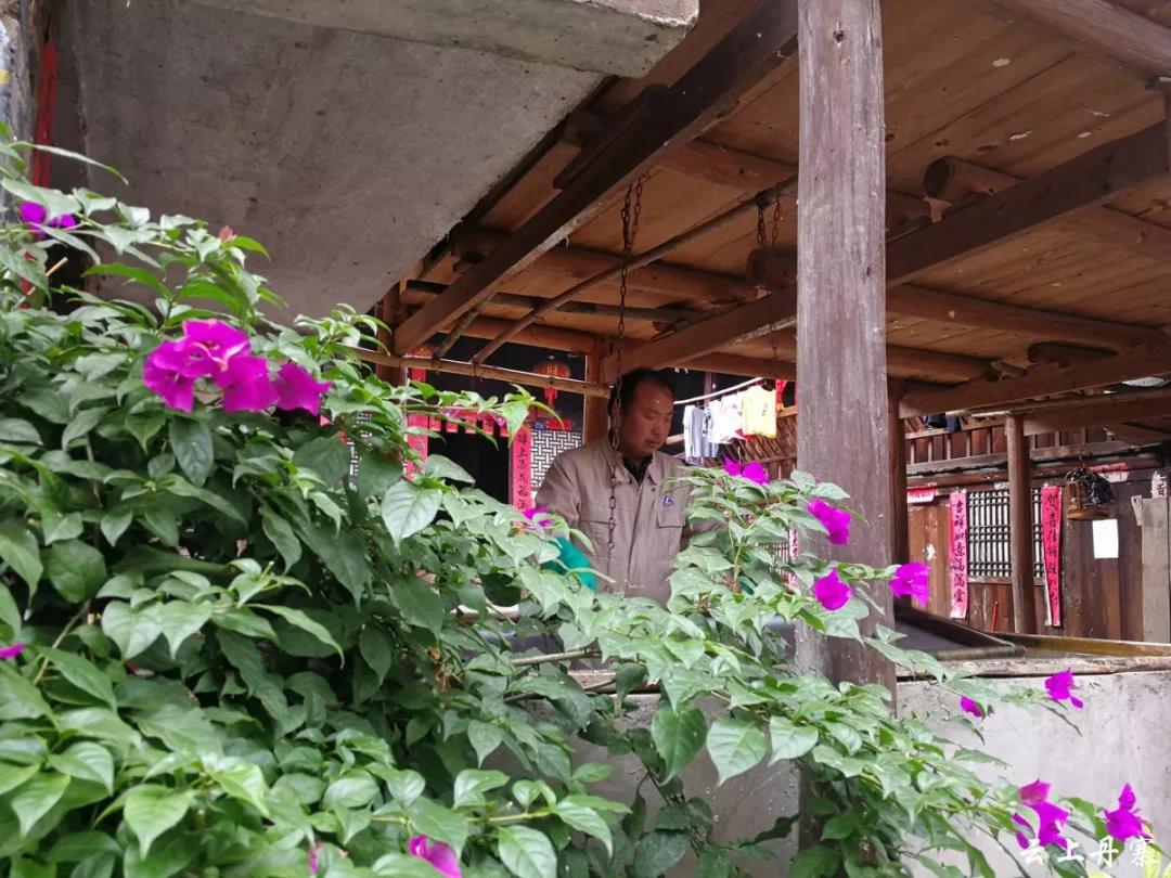 43岁的刘光先家门口花儿开得正好,他在院子里做纸,我们径直走进他家的院子,习惯了游客进出的他没有招呼我们。