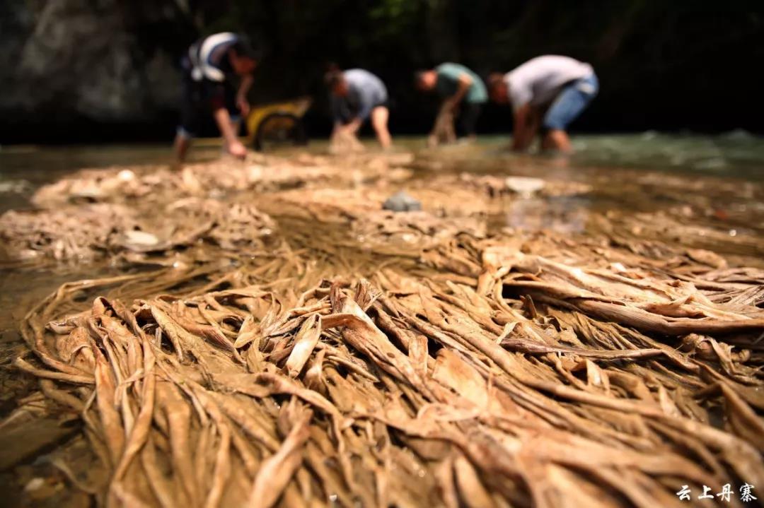 ▲在贵州省丹寨县南皋乡石桥村,王兴武(左一)和工匠们在河里清洗造纸原料。